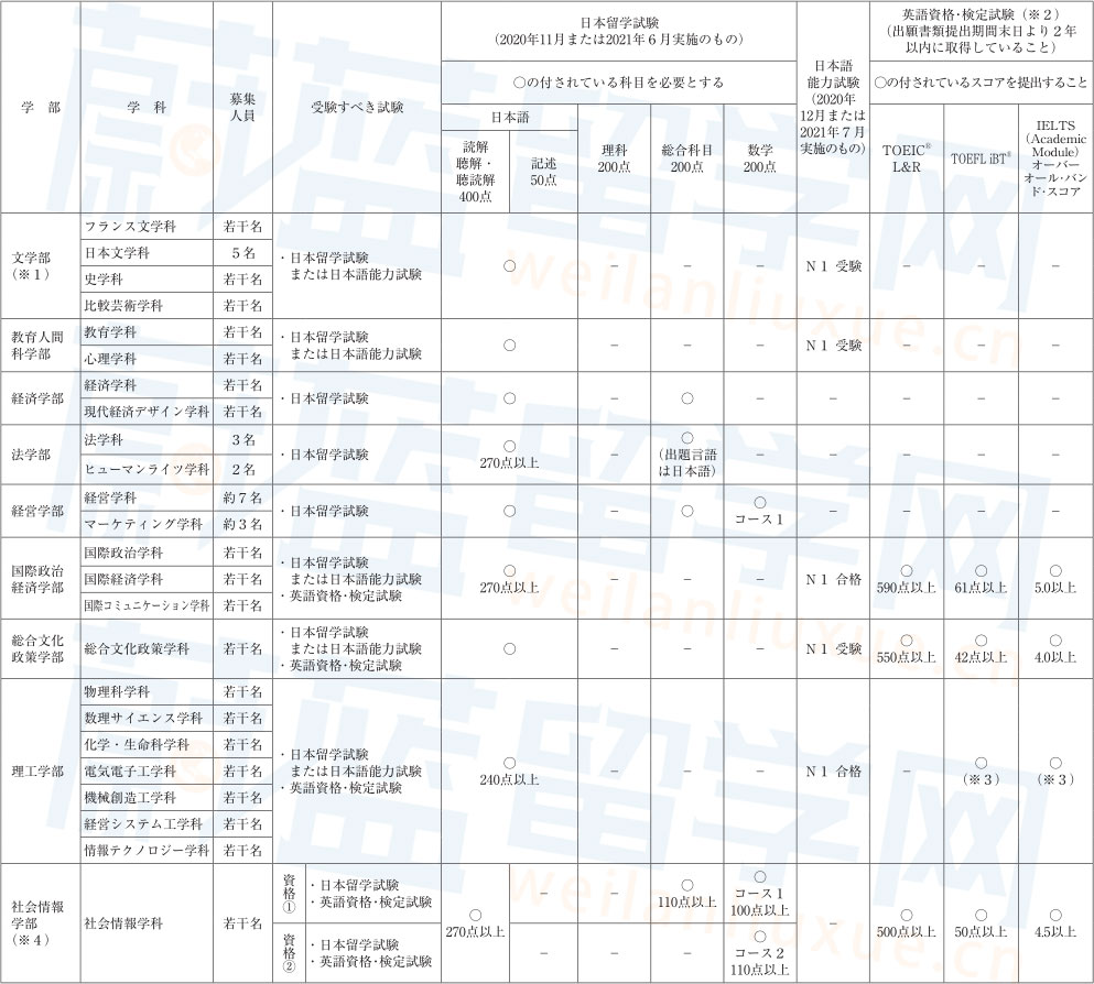 下图是青山学院大学各学部对留学生日本留考EJU成绩和英语成绩的要求总汇。