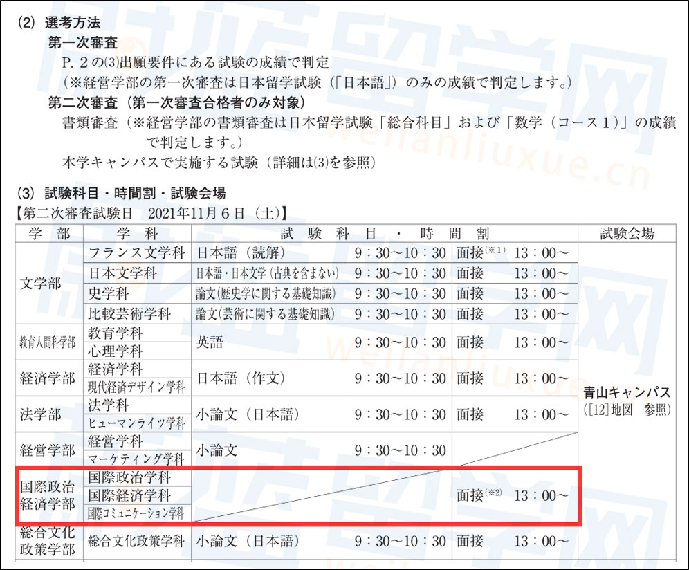 青山学院大学学部考试流程一般为“两次选考”,分别是EJU日本留考成绩查看+校内考。青山学院大学校内考分为笔试+面试,但是也有的学部校内考只有面试,比如国际政治经济学部。