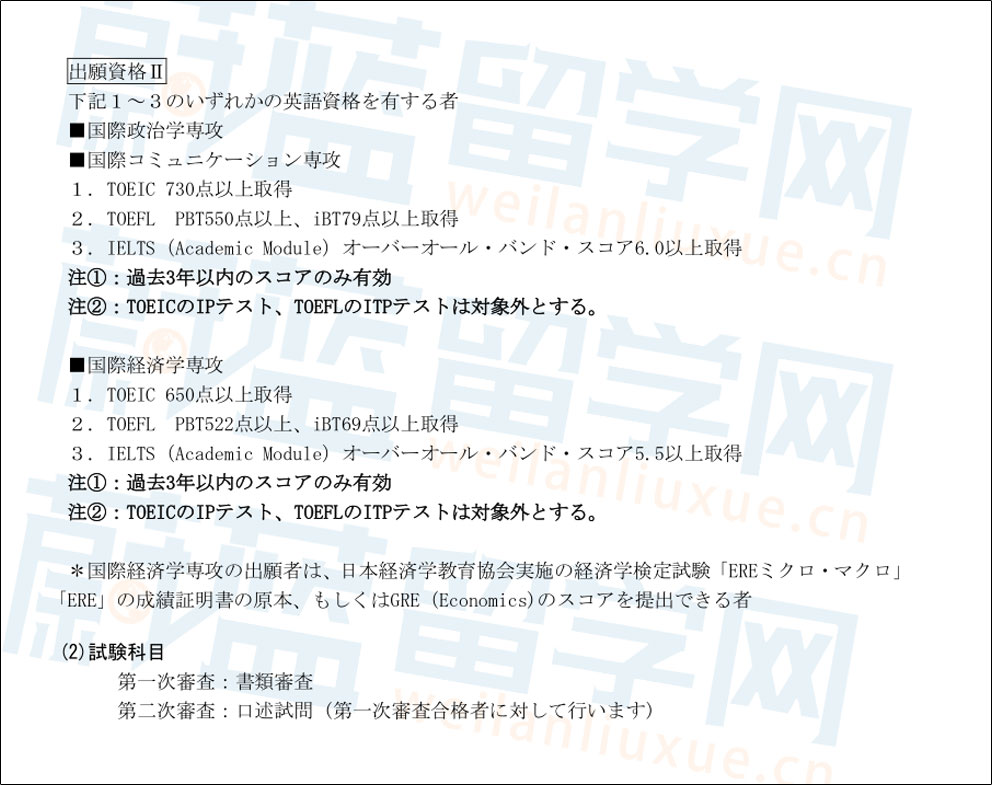 青山学院大学的国际政治经济学研究科细分为:国际政治学、国际经济学、国际交流学三个专攻。这个研究科入学考试只需要书类审查和面试,不过对英语有一定的要求,而且要求必须在3年以内的成绩。所以,想要报考这个研究科的同学,蔚蓝留学提醒一定要提前准备好英语等相关成绩,不要错过报名。